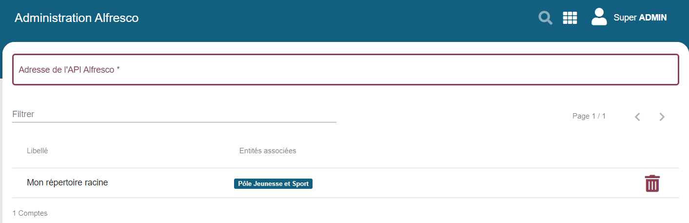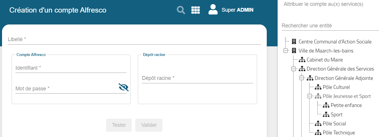 | Entités rattachées | Sélection d'une ou plusieurs entités pour lesquelles ce compte sera utilisé. Il est possible ainsi de lier les entités à des dépôts racines différents. Un seul dépôt par entité |