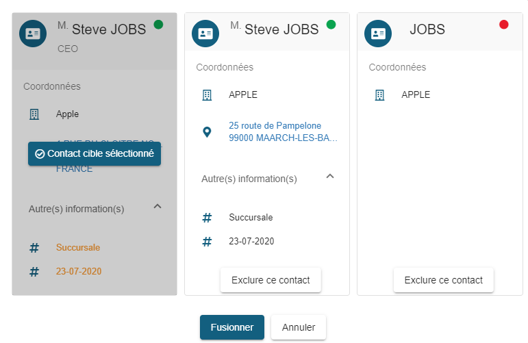Note : seules les données absentes de la fiche contact cible mais présentes dans les fiches contacts source sont ajoutées