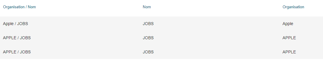 Les doublons trouvés en fonction des critères indiqués s'affichent par "blocs de doublons" sur fond grisé alterné.