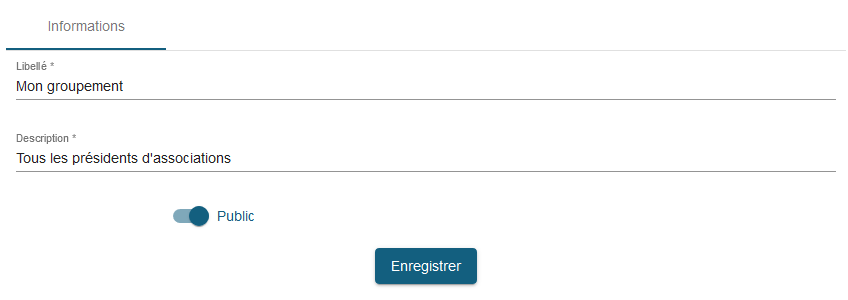 | Libellé | le nom du groupement tel qu'il pourra être recherché via l'autocomplétion des contacts par l'utilisateur | |