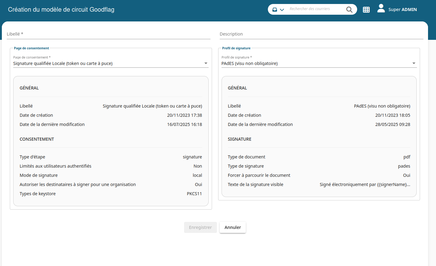 Pour créer un nouveau template, il est nécessaire de saisir un libellé ainsi que choisir une page de consentement et un profil de signature. Ces deux listes déroulantes sont récupérées du paramétrage effectué sur l'application Goodflag directement. Elles ne peuvent être créées ou modifiées que sur l'application distante.