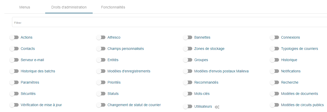 Un filtre de recherche propose de localiser rapidement la fonctionnalité souhaitée.