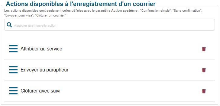 Les actions disponibles sont seulement celles définies avec le paramètre Action système : "Confirmation simple", "Sans confirmation", "Envoyer pour visa", "Clôturer un courrier" et les actions pour enregistrer un recommandé