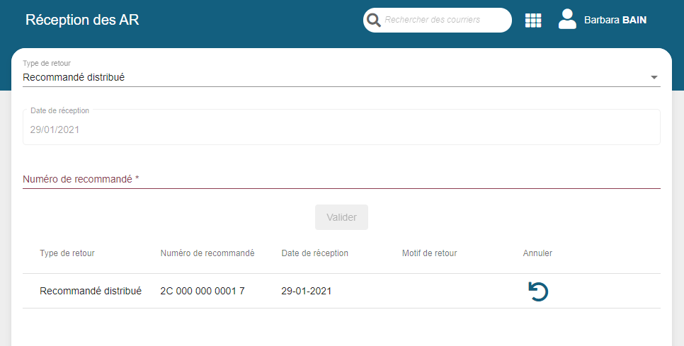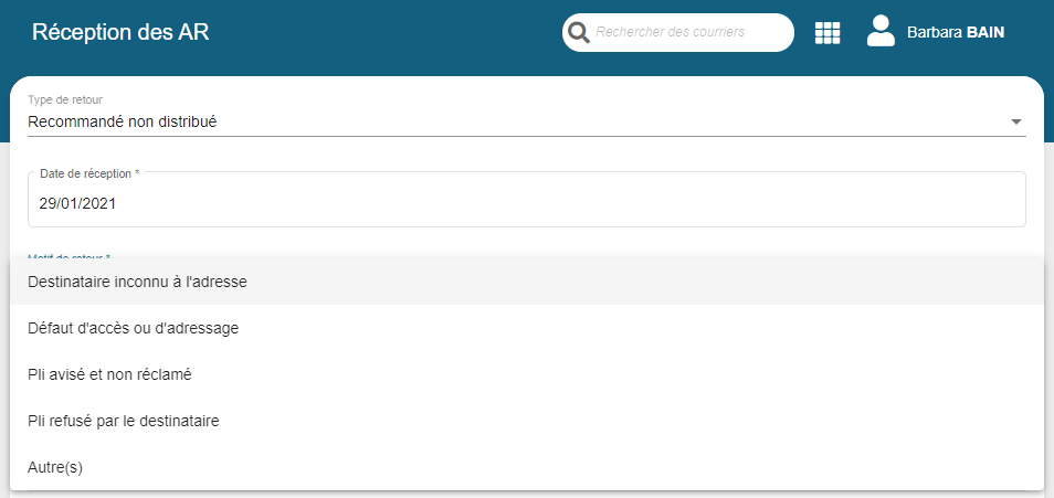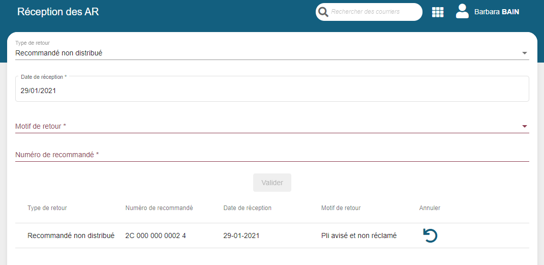 Après saisie, le bordereau est marqué comme non distribué avec la date du jour de réception et le motif de non distribution.
