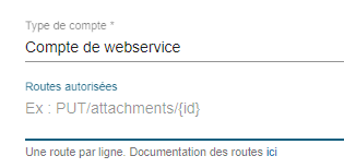 | Type Compte de Webservice accès seulement via l'API REST de Maarch Courrier et non via la page de connexion Pour ce type de compte il est possible de restreindre les routes autorisées ![]() Si une ou plusieurs routes sont précisées,toutes les autres routes sont interdites d'accès par le compte. Si rien n'est précisé, toutes les routes sont accessibles |