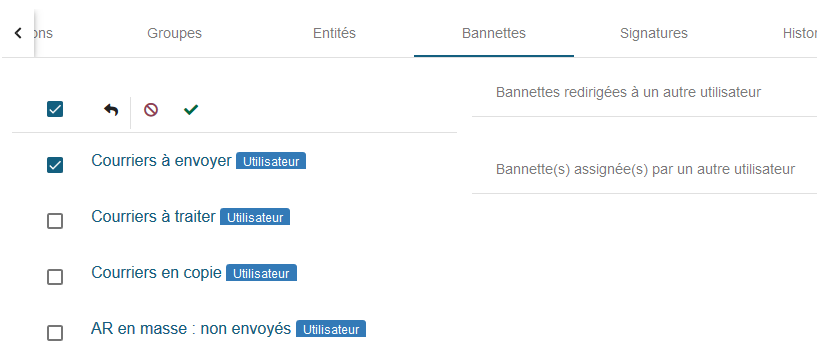 Afin d'éviter qu'un utilisateur appartenant à plusieurs groupes fonctionnels ait des bannettes en doublon, il est possible de "désactiver" une ou plusieurs bannettes ou bien de les rediriger vers un autre utilisateur.