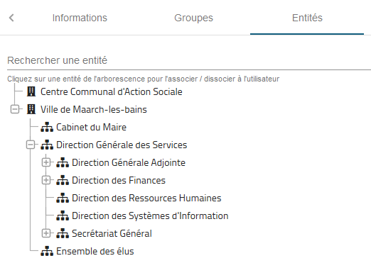 | Cliquer sur l'entité à affecter | Ajouter l'utilisateur à une ou plusieurs entités organisationnelles Action à refaire pour chaque entité |