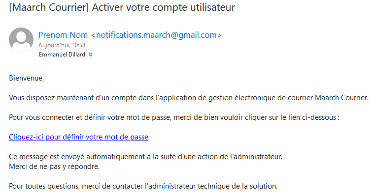 A la fin du processus de création d'un utilisateur, un courriel est envoyé à celui-ci afin qu'il puisse se connecter et définir un mot de passe personnel.
