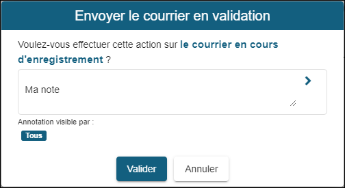 Choisir l'action "Envoyer le courrier en validation" dans la liste des actions disponibles en pied de formulaire
