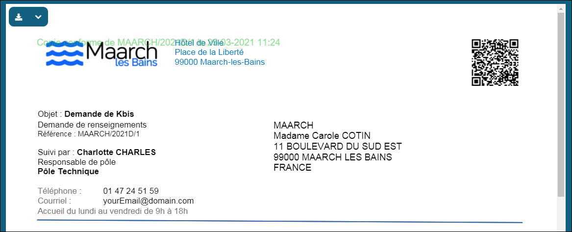 Maarch Courrier se positionne sur la fiche détaillée du courrier enregistré