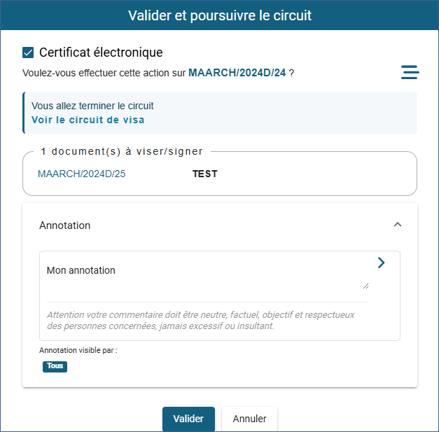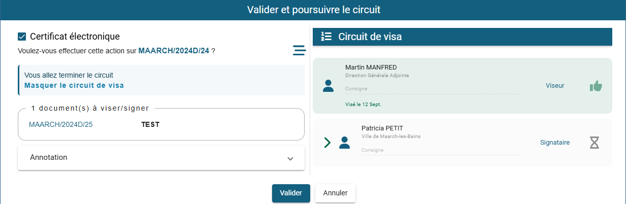 L'action correspondant à une poursuite du circuit (visa où signature) propose l'interface suivante :
