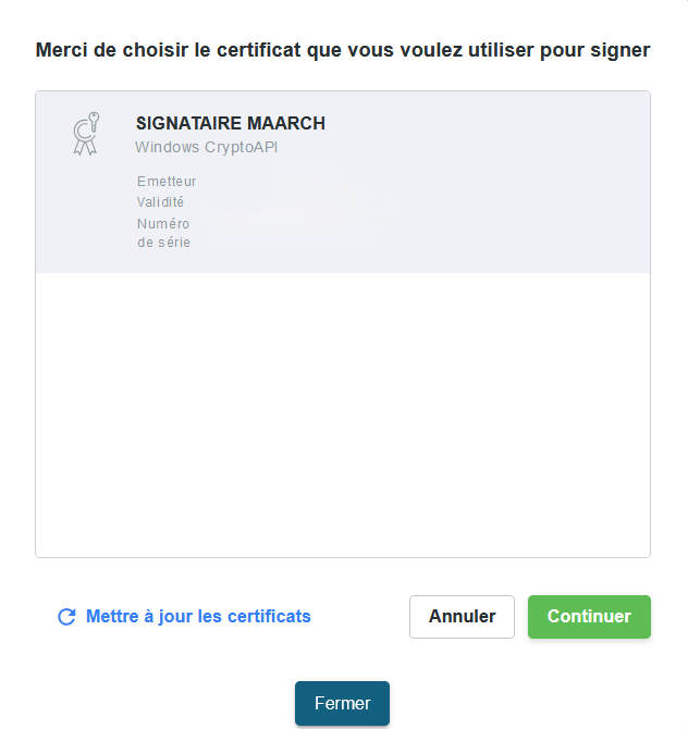Lors de la signature électronique, au moment de la validation une fenêtre avec tous les certificats disponibles sur le poste utilisateur apparaît.