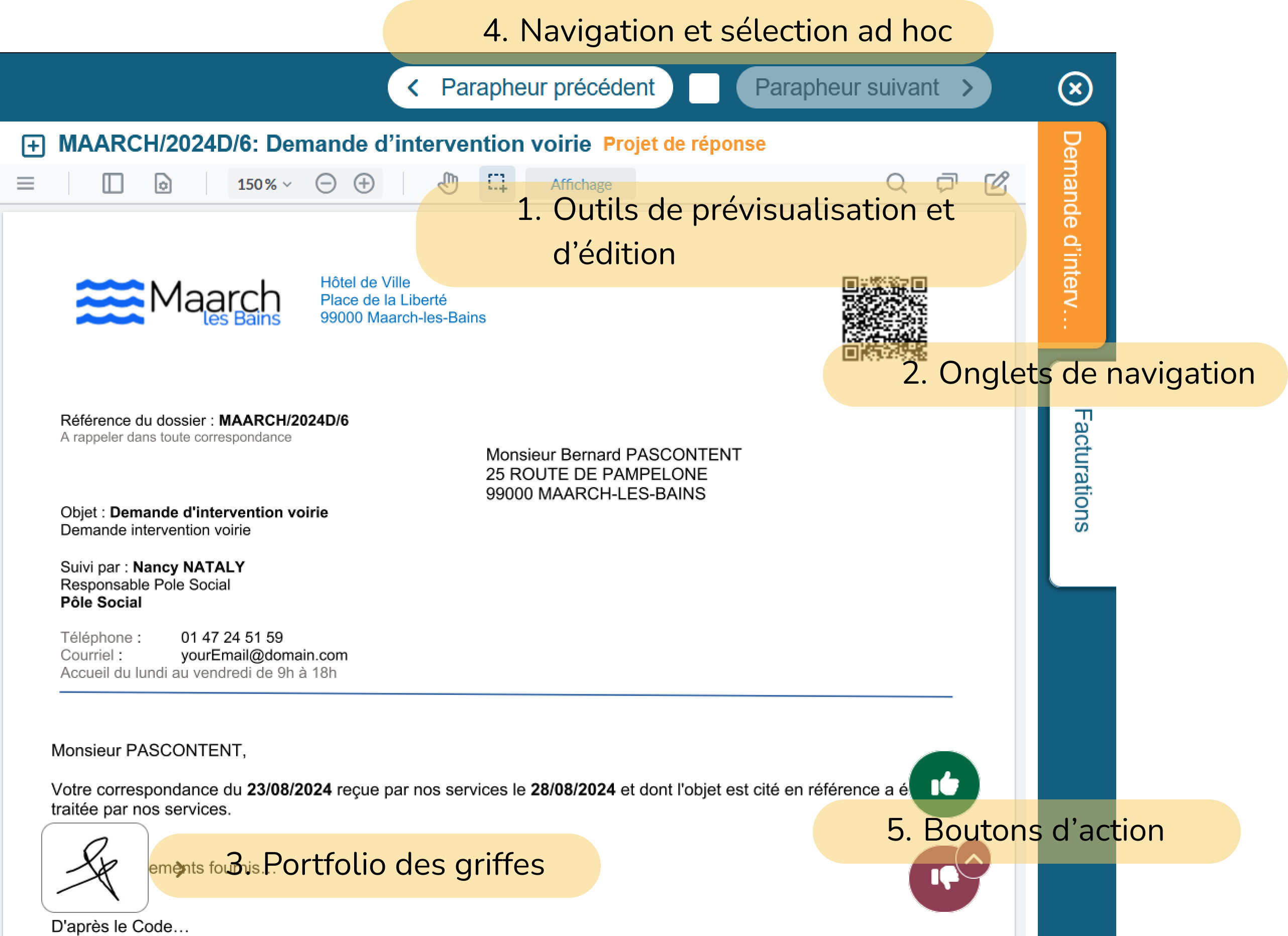 La zone de droite de l'interface du parapheur électronique présente à l'utilisateur :
