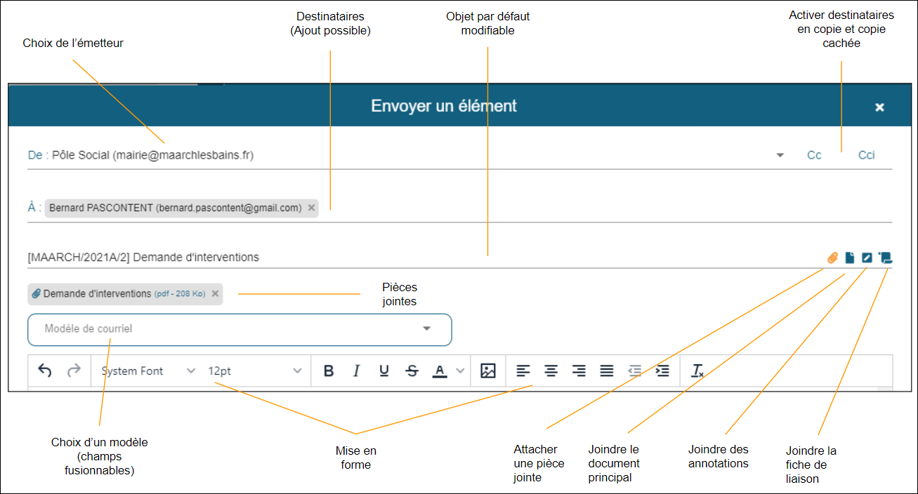 On peut envoyer le document avec les pièces jointes associées par courriel, en choisissant l'adresse courriel d'expédition parmi la sienne ou celle de ses services.